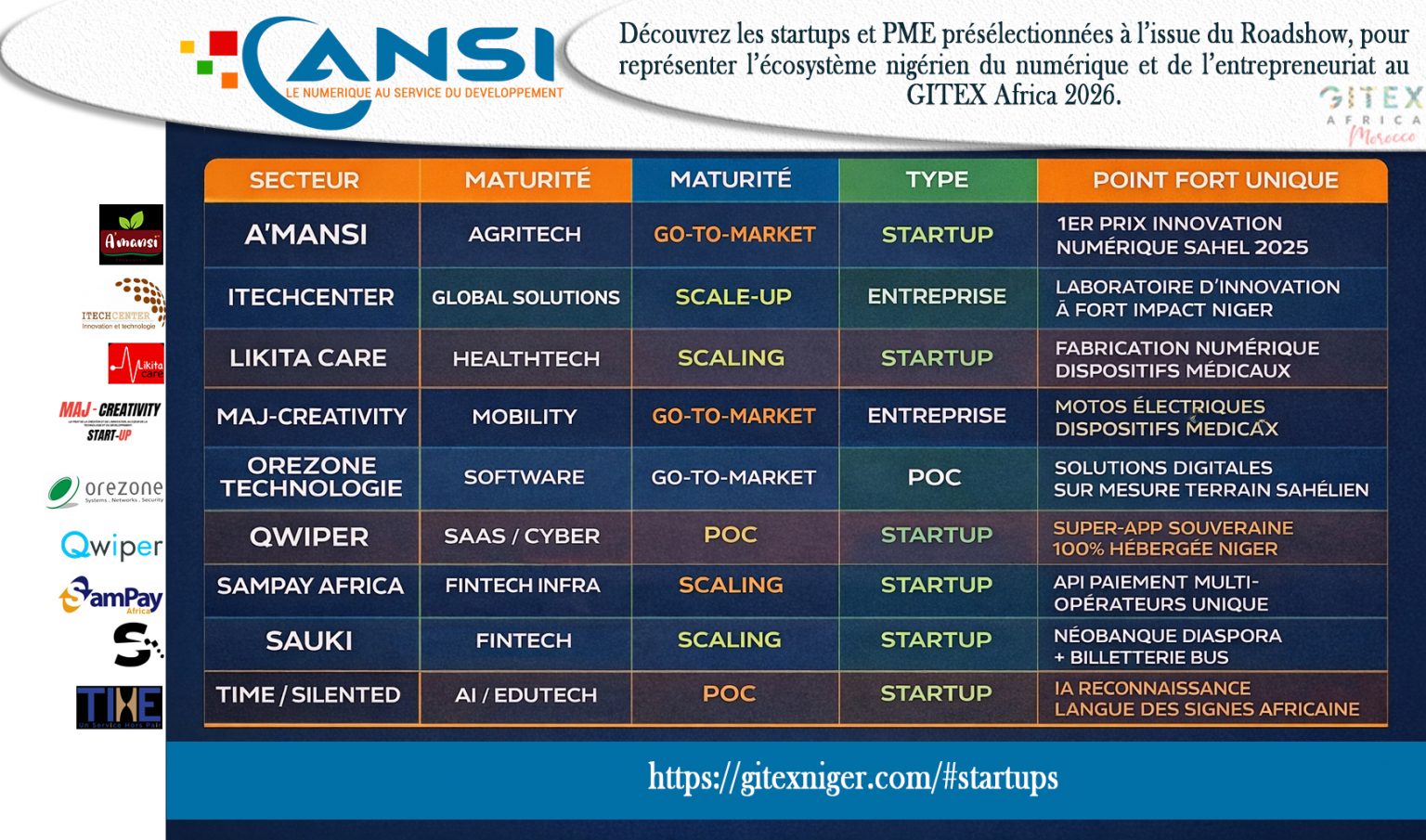 La liste des startups et PME présélectionnées à l’issue du Roadshow, pour représenter l’écosystème nigérien du numérique et de l’entrepreneuriat au GITEX AFRICA 2026….